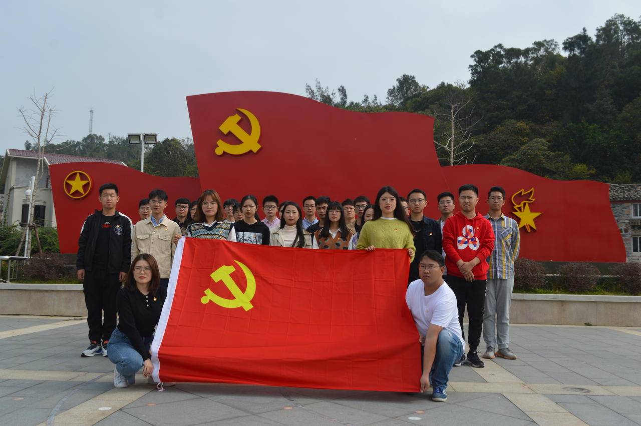 最后,在纪念馆前的广场上,全体党员怀着崇敬的心情,面对鲜红的党旗,高举右拳,重温入党誓词,不忘初心、牢记使命。