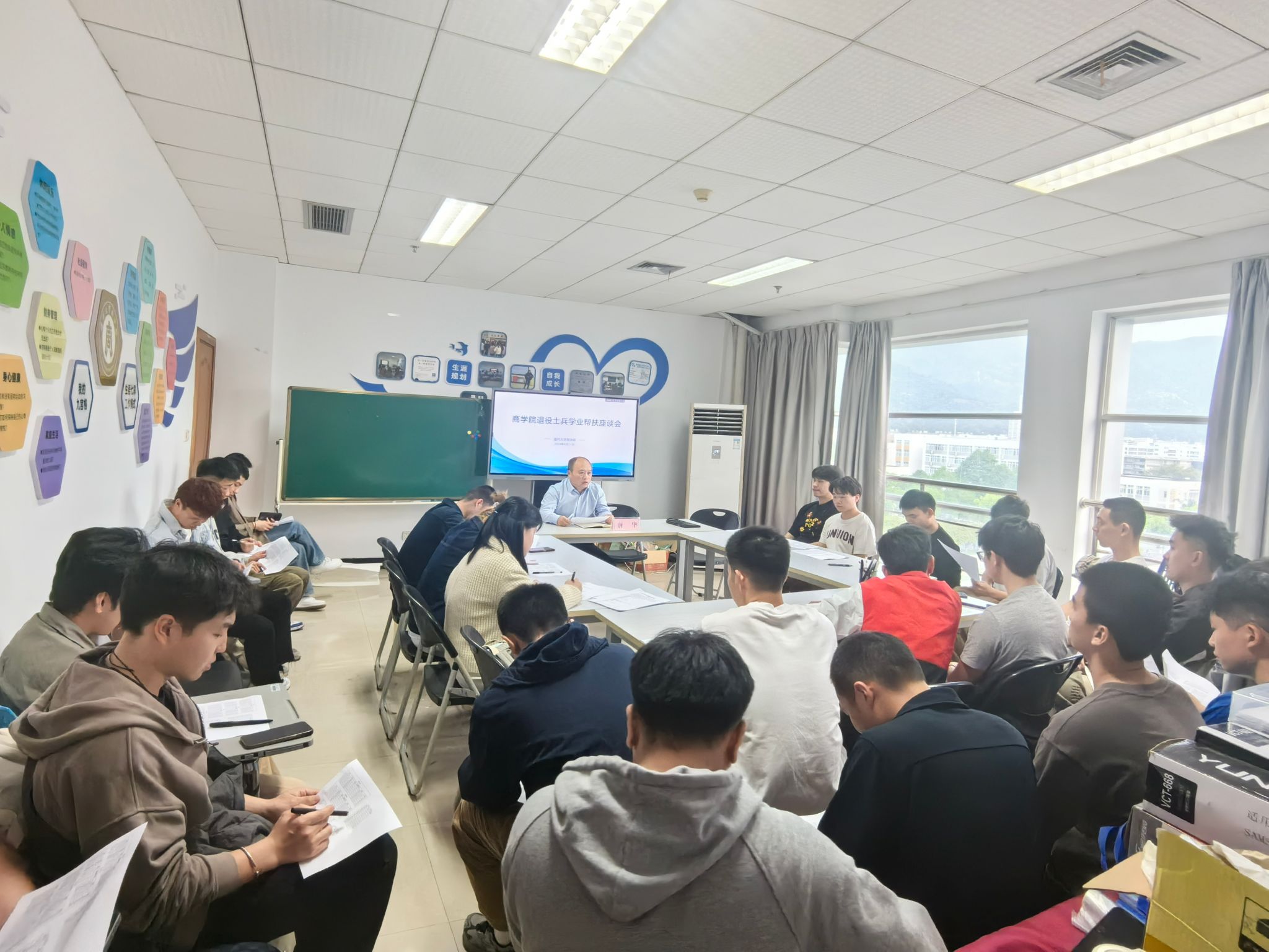 举行23级专升本退役大学生士兵学业帮扶座谈会。党委副书记唐华,学生科辅导员王景欣、张春洋以及27名退役大学生士兵参加会议。