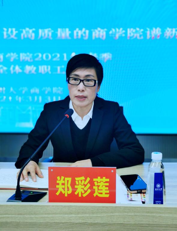 学院党委书记郑彩莲作总结讲话。她首先对金融工程、国际贸易两个专业获批国家一流专业建设点和9位老师在全校的教工大会上受表彰的喜讯表示祝贺,代表学院党委向全体老师在在自己的岗位上作出不平凡的贡献表示衷心的感谢和崇高的敬意。她要求全体老师要切实提高政治站位,认真贯彻落实谢树华书记、赵敏校长在2021年春季新学期全体教职工大会上的讲话精神。随后她以《勇争先 开新局 为建设高质量的新澳门六合彩资料